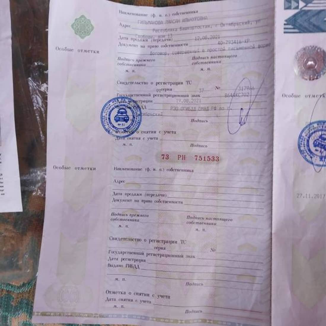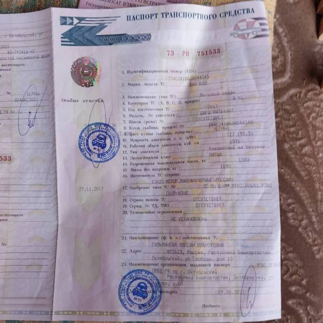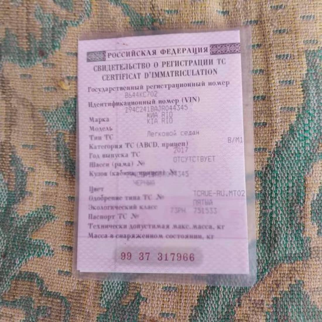 КИА RIO, марка: КИА, модель: RIO, год изготовления: 2017 г.в., цвет: черный, VIN: Z94C241BAJR044345, ПТС: 73РН751533, г/н: В644КС702, изготовитель (страна): Россия, модель двигателя: G4FG, тип двигателя: Бензиновый, двигатель №: HW564007, мощность двигателя, л. с. (кВт): 123 (90.5), рабочий объем двигателя, куб. см: 1591, шасси (рама) №: Отсутствует, кузов №: Z94C241BAJR044345, экологический класс: Пятый, разрешенная максимальная масса: 1580, масса без нагрузки: 1190, организация-изготовитель ТС: хэндэ мотор мануфакчуринг, вид собственности: индивидуальная. Автомобиль имеет существенные следы эксплуатации